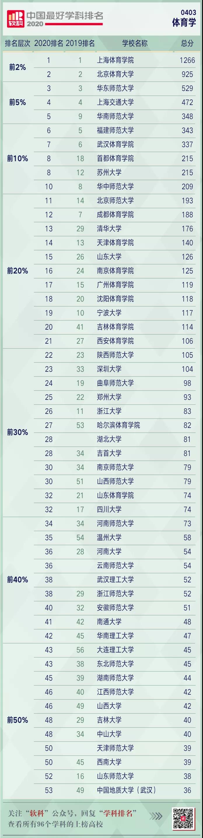 10月15日,高等教育评价专业机构软科正式发布“2020软科中国最好学科排名”,排名榜单包括96个一级学科,体育学学科排名共有53所大学上榜。公司体育学排名全国体育学科第30名,位列前30%,较2019年排名上升21位,是学校7个上榜学科名单之一。
