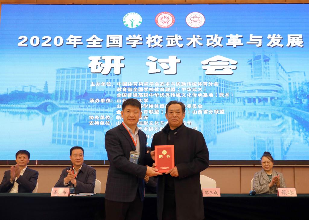 中国体育科学学会武术与民族传统体育分会秘书长郭玉成教授为聘任的兼职教师、形意拳名家张智录先生颁发聘书