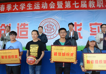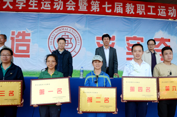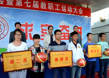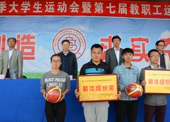 运动会总裁判长闫保红宣布比赛成绩:生命科学学院和历史与旅游文化学院获团体操表演最佳组织奖;员工组比赛前六名分别是生命科学学院、经济与管理学院、数计学院、物信学院、传媒学院和政法学院,最佳组织奖由化材学院、教师教育学院获得;教工组比赛前六名分别是生命科学学院、图书馆、化材学院、机关一工会、教师教育学院和数计学院,物信学院、机关二工会摘得最佳组织奖。