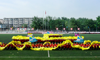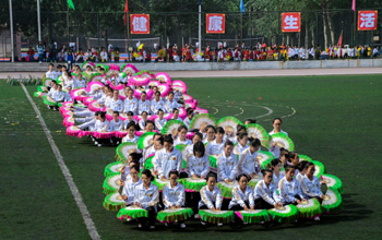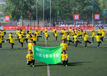 在悠扬动听的旋律中,精彩的团体操比赛开始。首先展示的是戏剧与影视学院,他们先后变化成八卦图、风车、海浪和五环的形状,青春洋溢的舞蹈极大地活跃了现场的气氛;历史与旅游文化学院的学子们手拿金扇,做出各种美丽的造型;经济与管理学院用彩扇分别摆出花团、波浪、“梦”、“V”字等图案,充分展示了经管学子必胜的信心;生命科学学院通过变换队形配合多样的道具展示了生命的伟大。全校师生沉浸在青春活力与激情热烈的气氛中。