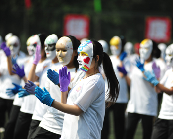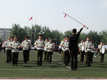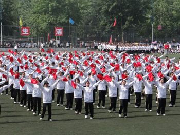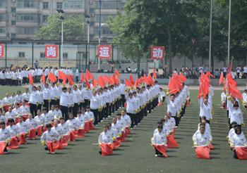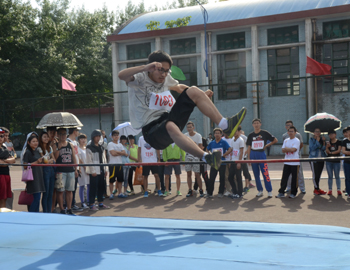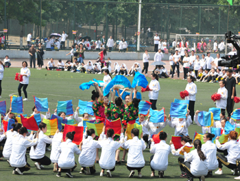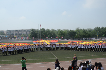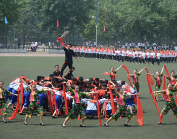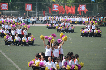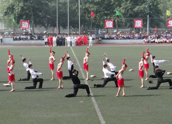 上午九点,运动会正式拉开帷幕。公司国标舞队进行开场舞表演,女生着红色短裙,男生着黑色西装,活力四射的舞蹈令整个田径场沸腾。随后,独具学院特色的团体操比赛有序进行。打头阵是新成立的书法学院,他们以太极为主,彰显博大的中华文化;文学院文用红黄相间的旗帜摆出“2015”“师大”“文院”“文武”的字样展示“文动乾坤,气冲霄汉”的气势;教育技术与传媒学院在黄河大合唱的旋律中带我们重走红色征程,用肢体动作诠释中华精神。随后的比赛中,各学院代表队分别利用彩带、彩旗、扇子、绸带等道具,不断摆出造型,变化队形。“国旗”、“团旗”、“中国梦”等跃然呈现在绿茵场上。全校师生沉浸在这片欢乐青春活力与激情热烈的气氛中。