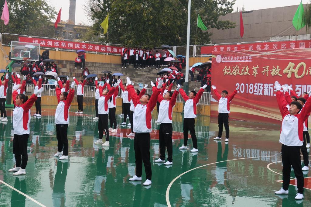 2018级新生队列队形暨广播体操比赛分甲乙组进行,其中体育教育系和体育教育二系为甲组,运动训练系、社会体育系、民族传统体育系为乙组。同学们身着整洁统一的服装,迈着矫健的步伐,喊着嘹亮的口号,动作整齐划一、伸展优美规范。比赛结束后,武术协会和运动训练系1703班的李俊博同学进行了武术和歌曲的精彩展演。