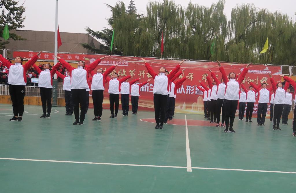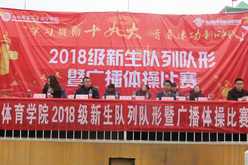 为庆祝学校六十周年华诞,庆祝改革开放40周年,深入学习贯彻落实党的十九大精神,积极推进全院体育教学实践活动的开展,11月10日14:30,学院举办以“学习贯彻十九大·青春建功新时代”为主题的2018级新生队列队形暨广播体操比赛。公司党委副书记孙学虎,各系部科室主要负责人和专职辅导员出席,张秀珍、王永明、王红芳、黄志高、赵海涛老师担任比赛裁判员,2018级共计13个班级新生参加比赛。
