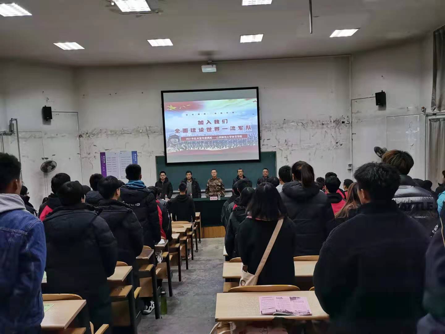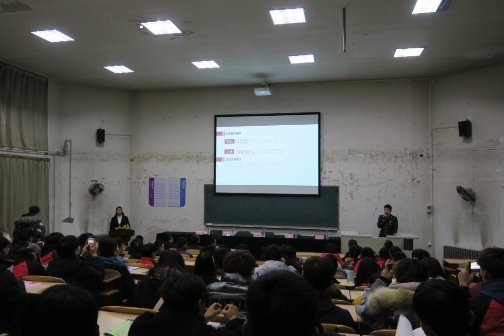 为进一步推进老员工应征入伍工作,帮助老员工了解、掌握应征入伍的相关政策和流程,鼓励员工献身国防事业。12月17日晚19:00,由beat365APP武装部、beat365唯一官网团委主办,beat365唯一官网员工社团联合会、国防军事拓展协会、beat365APP网络攻防支援排承办的“参军报国,无上光荣”2021年beat365唯一官网征兵宣讲会在阶一教室,尧都区西街办事处武装部部长郭利林、校武装部军事教研室主任李文、武装部专干任金虎、三校区保卫科科长郝宝喜、院团委副书记程祖浩参加,120余名同学聆听了宣讲会。