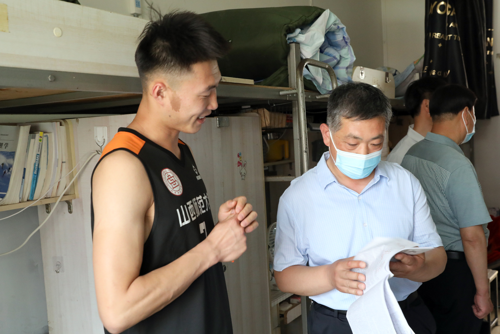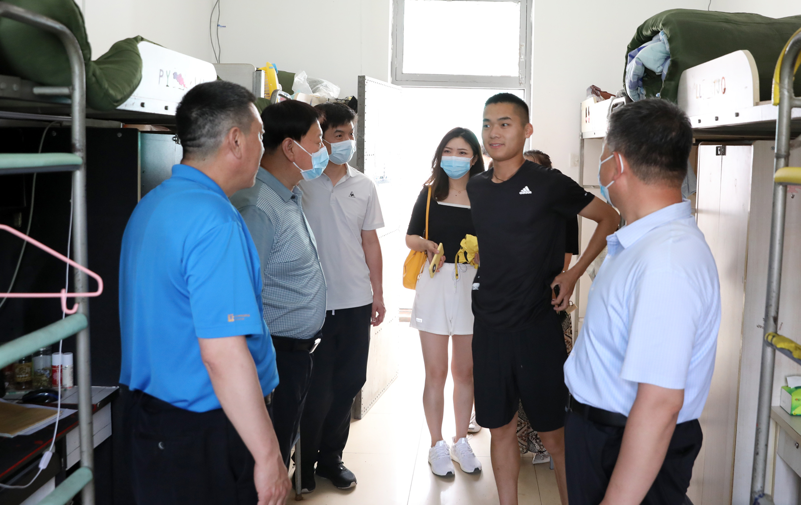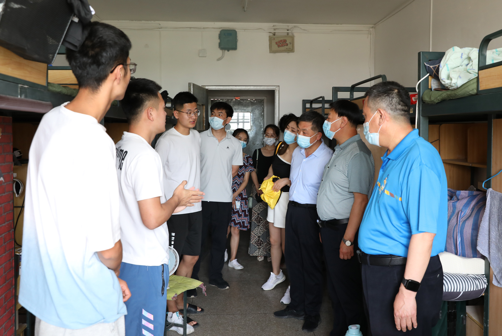王军峰处长及学院领导老师一同走访了员工宿舍。走访过程中,王军峰处长及院领导与在校员工进行了亲切交谈,了解近期同学们的学习生活情况,耐心解答大家的问题和疑惑。在毕业生宿舍,老师们与毕业生进行了深入交流,了解了大家对临时分配宿舍是否适应、四六级考试准备是否充分、家庭所在地及回家方式以及毕业后对未来的规划等情况。在走访宿舍的过程中,各位领导提醒同学们要结合当前疫情防控形势增强安全意识,加强沟通交流,有问题及时向辅导员反应,相互团结,共同学习,共同进步。