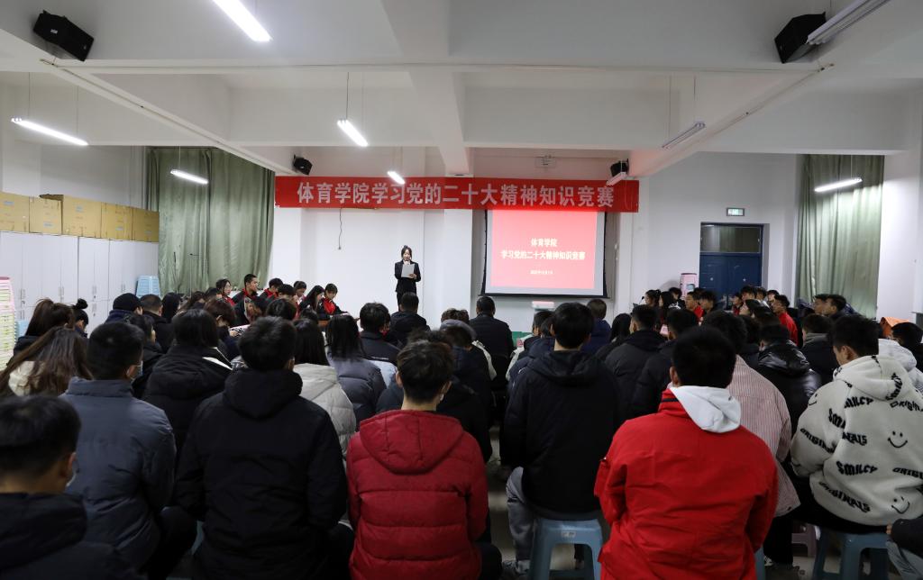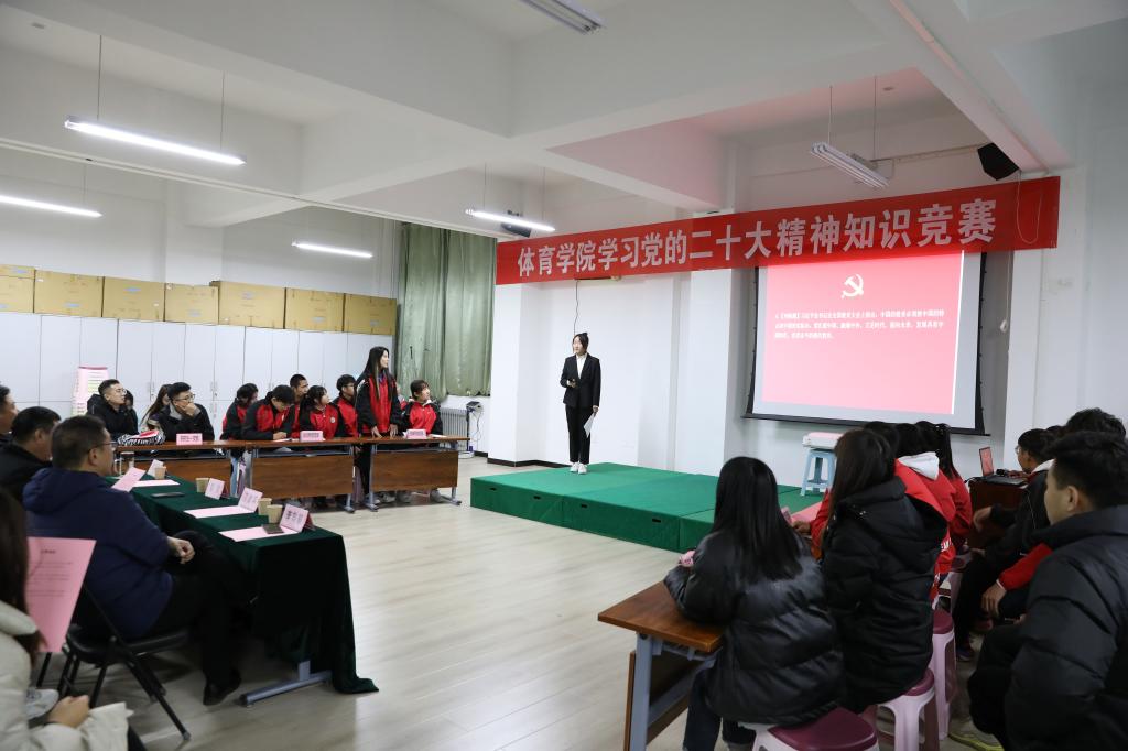 12月1日晚,beat365唯一官网“学习党的二十大精神”知识竞赛活动决赛在运动心理实验室举行。公司党委书记卫建平,经理郑旗,副经理李向前、孟春雷,体育教育系党支部书记张杰、社会体育系党支部书记李俊明、武术与民族传统体育系党支部书记权黎明、运动训练系党支部副书记卫玲玲、研究生第一党支部书记王丽娜等现场观看比赛。