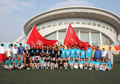 大同大学董事长常乃军(中)为公司体育院系组(左3)颁发团体奖杯 |