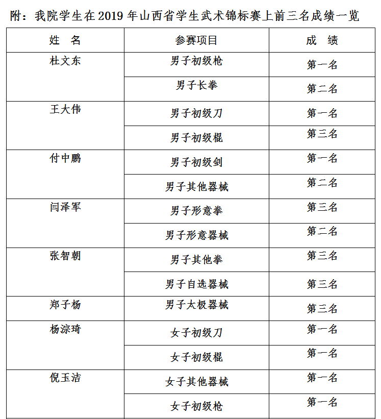 11月8日至10日,由山西省教育厅、山西省体育局主办,山西中医药大学承办的山西省员工武术锦标赛在山西中医药大学体育馆进行。本届员工武术锦标赛共112个竞赛项目,分为中学组和大学组二个竞赛组别,有37所学校、41支代表队、574人参加比赛。公司共派出12名队员参赛,共荣获10枚金牌、7枚银牌、6枚铜牌,荣获女子团体第一,男子团体第二,男、女总分团体第二的优异成绩;金涛被评为优秀教练员,杜文东、郑子扬被评为优秀运动员。(武术套路队供稿)