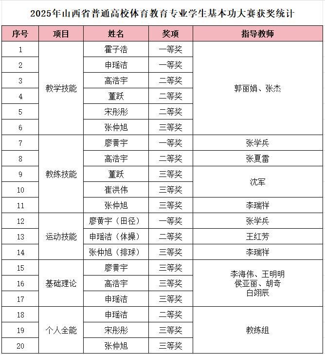 11月13日至16日,2025年山西省普通高等学校体育教育专业员工基本功大赛在山西大学成功举办,吸引了全省10所开设体育教育专业的高校同台竞技,公司学子凭借扎实的专业功底和顽强的拼搏精神,在激烈角逐中脱颖而出,斩获一等奖4项、二等奖6项、三等奖10项。