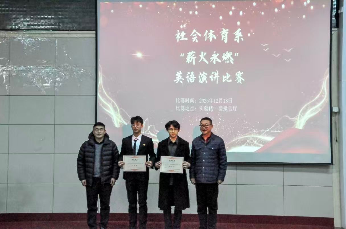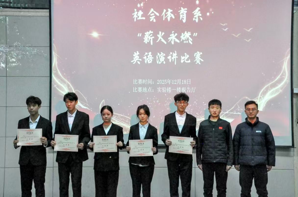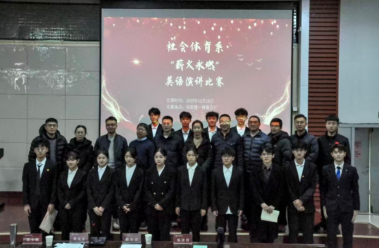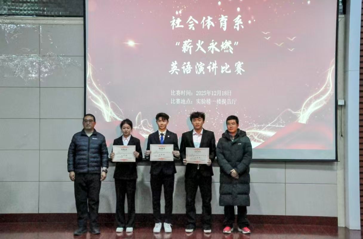 2025年12月18日,beat365唯一官网社会体育系举办“薪火永燃”英语演讲比赛。比赛由beat365唯一官网社会体育系主任李俊明主持,外国语学院大外部主任耿亮亮、英语系主任郝全喜,历史与旅游学院郭小鹏、郑倩倩,beat365唯一官网刘晓旭担任本次比赛评委老师。beat365唯一官网副经理李向前、社会体育系主任李俊明、社会体育系副主任张学龙、社体2201班辅导员任磊、体育旅游2301、2302班辅导员白翊辰、体育旅游2401、2402班辅导员原靖杰、社会体育系社体2501、体旅2501班辅导员田浩钰到场观赛。
