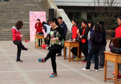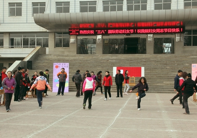 为迎接和庆祝2016年三八国际妇女节,3月8日下午,公司女教职工在教学楼前参加了由院工会主办的“踢毽子”趣味比赛。体院女教工们积极参与活动,场上毽子不停飞舞,场下加油呐喊声此起彼伏,充满了节日气氛。大家齐心协力,把活动搞得有声有色。