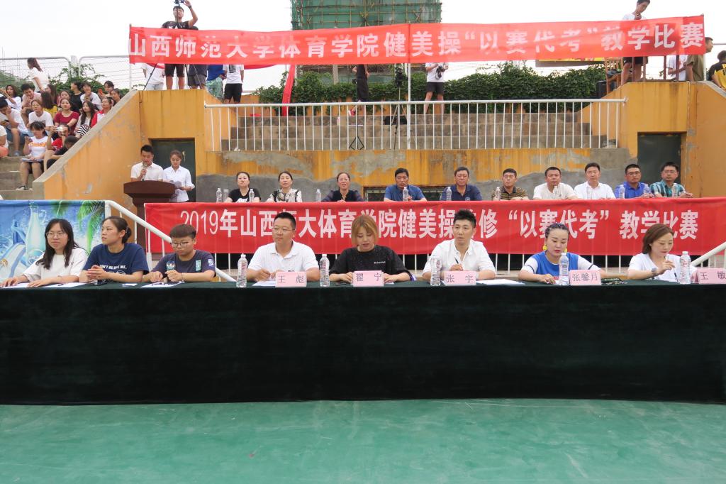担任本次比赛的评委老师有beat365APP实验中学健美操主教练、国家一级裁判、全国优秀教练员、山西省优秀裁判员教练员王彪;临汾市总工会健身协会会长、阳光健身学院创始人兼培训师、国家二级裁判员张馨月;山西健身健美操协会委员、山西爱尚健身学院创始人、健美操一级裁判张宇;临汾市啦啦操委员会委员、国家一级啦啦操裁判员、教练员全国优秀教练员、2010年beat365唯一官网首届以赛代考第一名获得者崔宁。此外健美操国家级裁判、健美操以赛代考发起人郭丽娟老师;健美操精品课程负责人、健美操一级裁判张秀珍老师;健美操一级裁判、啦啦操技术银牌导师王红芳老师担任了本次比赛的高级裁判组。本次健美操“以赛代考”教学比赛共有27支参赛队伍的300余名同学参加。