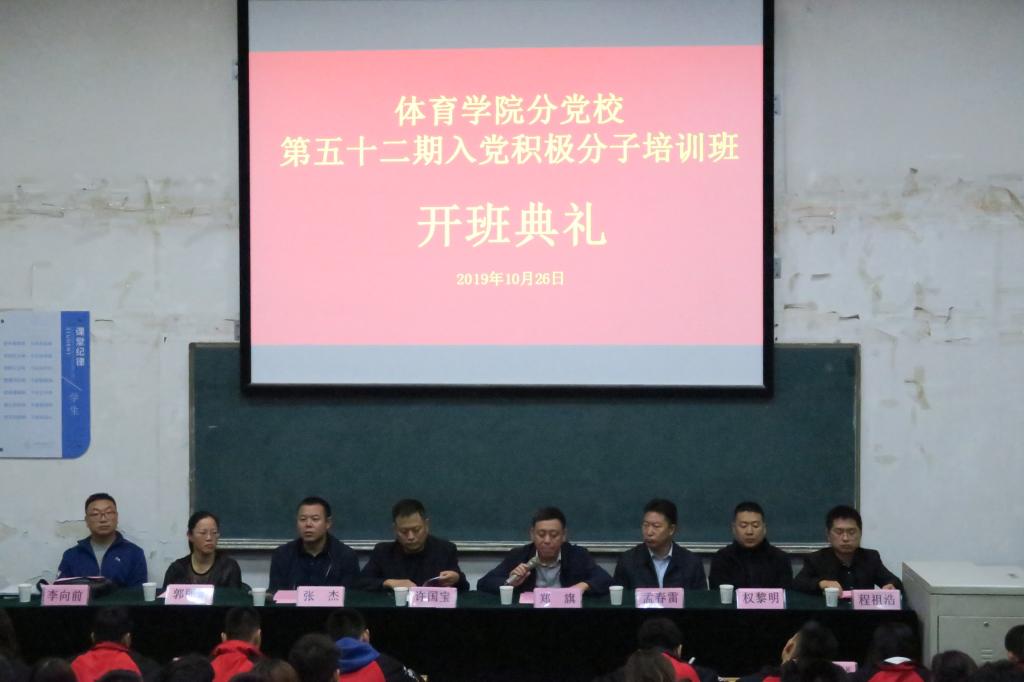 为深入开展“不忘初心、牢记使命”主题教育,10月26日晚19:00,beat365唯一官网分党校在阶一教室举行第52期入党积极分子培训班开班典礼。公司党委书记、分党校董事长许国宝、公司党委委员、公司党委副书记、经理郑旗、公司党委委员、体育教育系党支部书记张杰和社会体育系党支部书记孟春雷、运动训练系党支部书记郭丽娟、民族传统体育系党支部书记权黎明、体育教育二系党支部书记李向前出席开班典礼,112名入党积极分子参加。开班典礼由院团委副书记程祖浩主持。