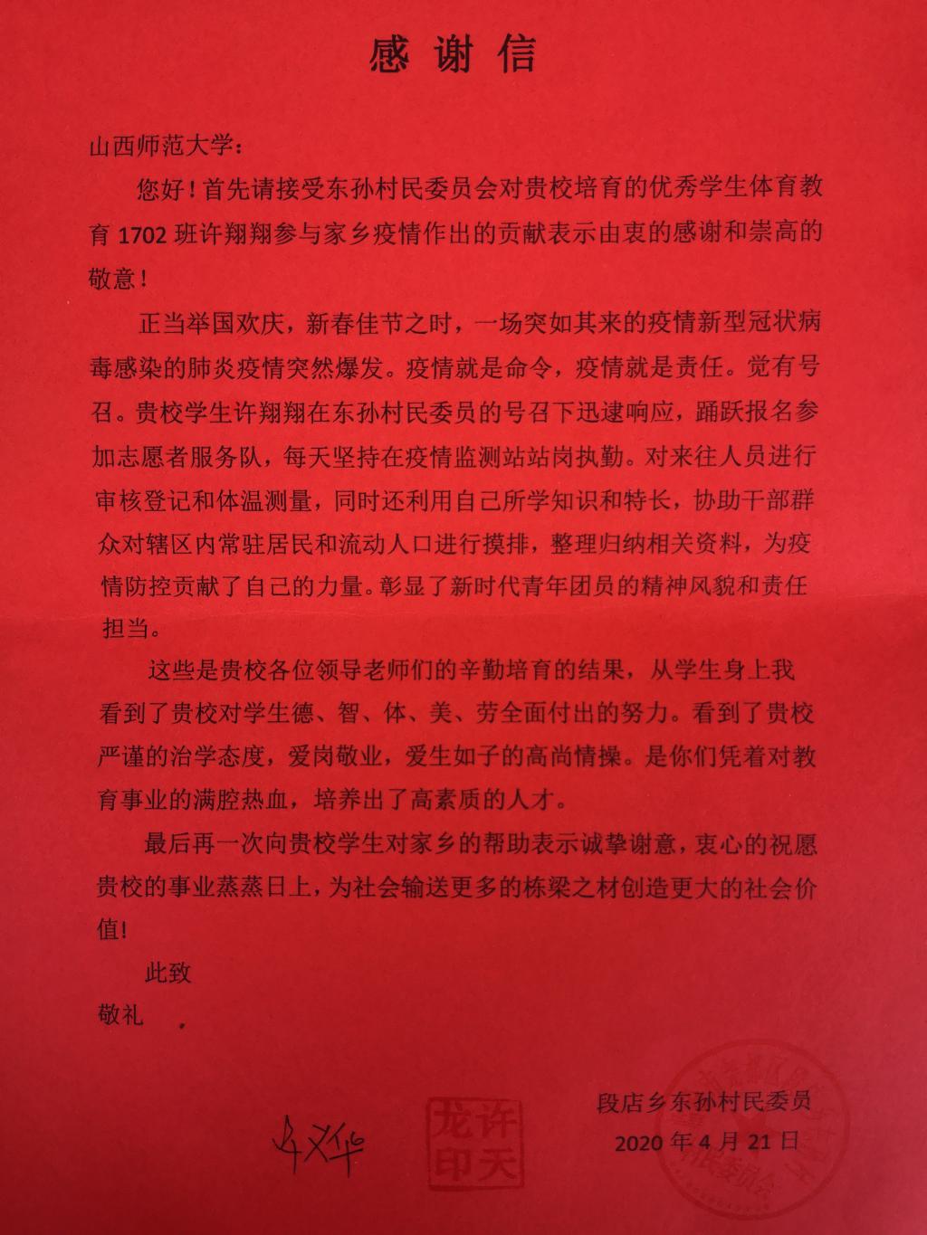 正当举国欢庆新春佳节之时,一场突如其来的疫情—新型冠状病毒肺炎疫情突然爆发。疫情就是命令,体育教育系1702班员工许翔翔在临汾市东村村民委员会的号召下,迅速响应,踊跃报名参加志愿者服务队。志愿期间,他协助本村干部群众对辖区内常住居民和流动人口进行摸排,每天坚持在疫情监测站站岗执勤,并对来往人员进行审核登记和体温测量,整理归纳相关资料等。他说:“是beat365唯一官网培养了我,作为一名入党积极分子,我应该积极发挥先锋模范作用,为人民群众、为党和国家贡献自己的力量,和全国人民一起抗击疫情!”。他利用自己所学知识和特长,为疫情防控贡献了自己的力量,得到了本村干部群众的高度认可与赞扬,也彰显了新时代青年团员的精神风貌和责任担当。(体育教育系供稿)
