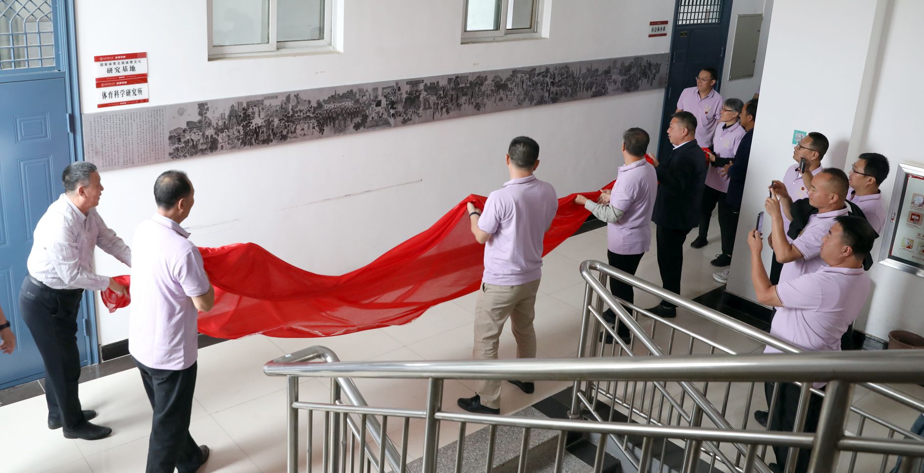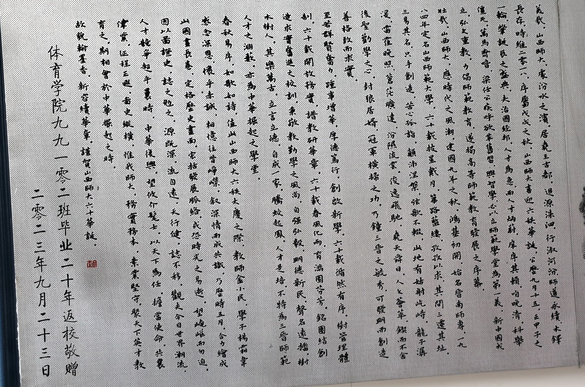 员工们逐一介绍了各自的情况,深情地回忆在母校学习的情景,分享了工作和生活经历。随后员工们还为学院赠送了由美术学院金小民教授等人共同创作的“晋师甲子春雨图”铝制板画卷,并进行了揭幕仪式。各位员工表示,将秉承母校的教诲,在工作中不懈努力,回馈社会,感恩母校,为母校的发展贡献自己的力量。(闫文菁/文 邓碾管/摄)