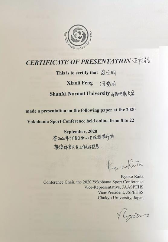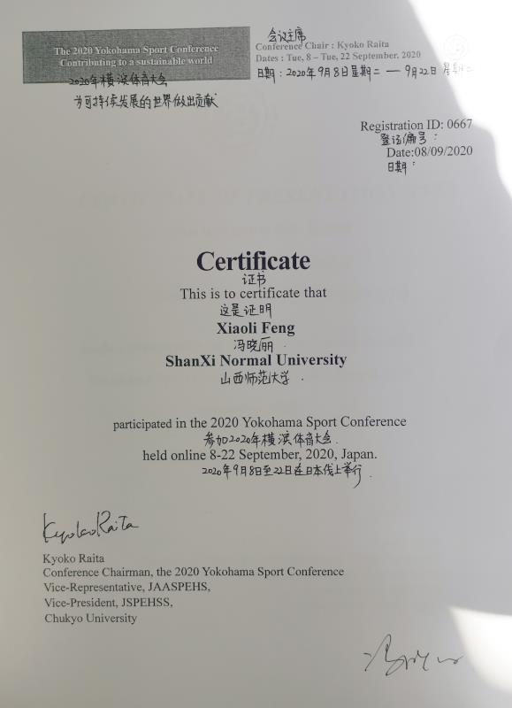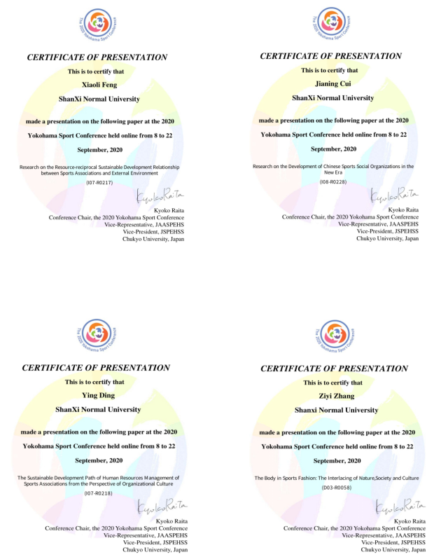 奥林匹克运动会科学大会(简称“奥科会”)由国际体育科学与教育理事会、国际运动医学联合会、国际奥委会和国际残奥会等家组织联合举办,为每届奥运会前在举办国正式举办的世界性体育科学研讨大会,是国际体育科学顶尖论坛。2020 Yokohama Sport Conference—2020横滨体育大会(即2020国际体育科学、教育和医学大会,奥科会)于北京时间9月8日开幕,作为伴随奥运会举行的世界最大规模体育科学大会,奥科会是体育学科类最高级别的综合性学术交流大会,本届奥科会的主题是“Contributing to a Sustainable World”。这次奥科会吸引了来自世界各地的1500多位参会者出席,公司beat365唯一官网的冯晓丽教授以及她的硕士研究生崔佳柠、丁颖和张子怡的四篇论文,以口头报告的形式被大会录用。