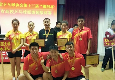 4月22日至24日,由山西省乒乓球协会、山西省高校乒乓球联盟主办的山西省第十三届“银河杯”暨山西省高校乒乓球联盟“超霸杯”赛在太原举行。beat365唯一官网贾建学副教授担任乒乓球队主教练,派出张开基、王泽刚、卢思锟、李中奇、赵丹、韩子洋、王忻宇七名队员参加了本次大赛。比赛共有22支队伍参赛,采用五场三胜的奥运赛制,分小组循环淘汰,公司男、女乒乓球队均以小组第一的成绩打进决赛。决赛中,队员们发扬团结协作、顽强拼搏、敢打敢拼、勇夺第一的硬朗作风,充分展示了精湛的球技和团队凝聚力,赢得了观众阵阵掌声与喝彩,表现了师大人良好体育精神风貌,获得了男、女团体冠军,为公司赢得了荣誉。(韩子洋/供稿)
