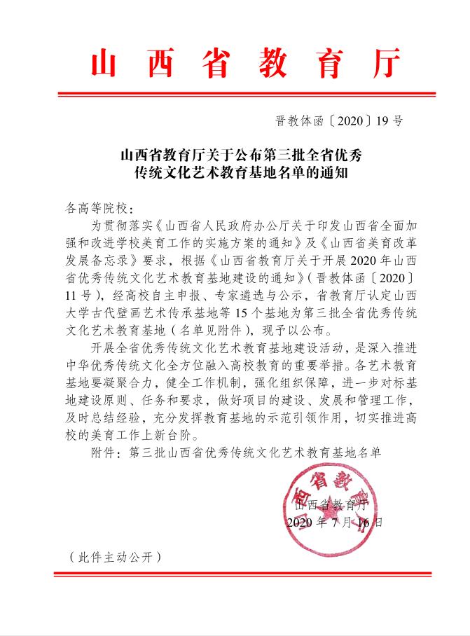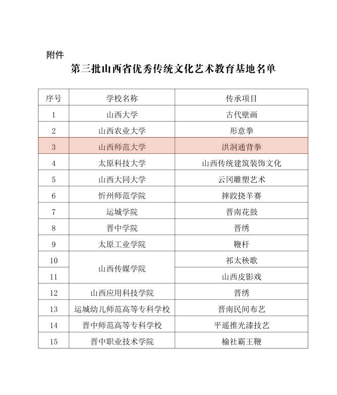 近日,省教育厅下发了《山西省教育厅关于公布第三批全省优秀传统文化艺术教育基地名单的通知》(晋教体函〔2020〕19号),全省共有15所高校的16个基地入选。公司申报的“洪洞通背拳”成功获批。
