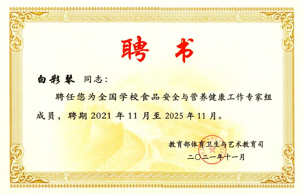 白彩琴教授受聘为全国学校食品安全与营养健康工作专家组成员