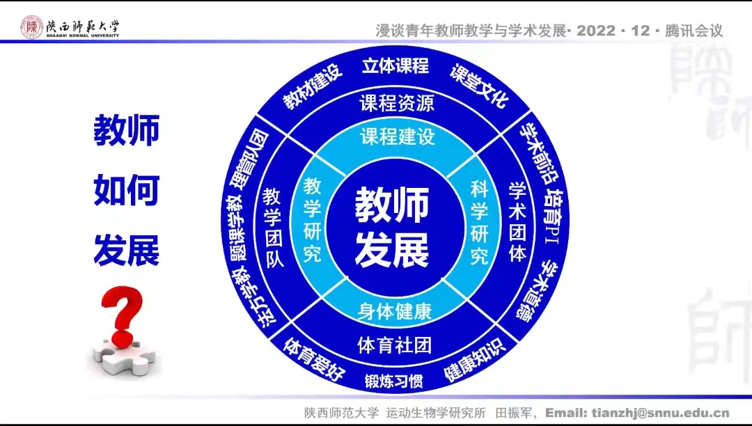 12月12日,公司举行2022年系列学术报告第六讲,邀请陕西师范大学运动生物学研究所所长,美国马里兰大学高访教授,全国模范教师,全国师德标兵,国务院政府特殊津贴专家,博士生导师田振军教授进行了题为《漫谈青年教师的教学与学术发展》的学术报告,报告由副经理李海伟主持,公司部分教师和全体研究生线上聆听了报告。