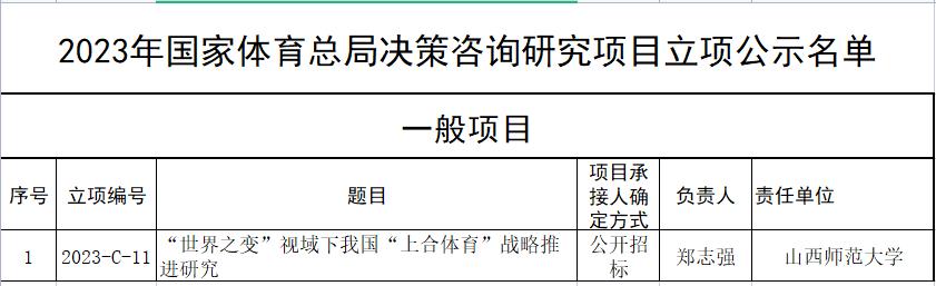 近日,国家体育总局政策法规司公布2023年国家体育总局决策咨询研究项目立项名单,共46项项目获批立项,其中重大项目6项,重点项目24项,一般项目16项。公司青年教师、在读博士郑志强副教授申报的“‘世界之变’视域下我国‘上合体育’战略推进研究”获批一般项目立项。该项目以“上合体育组织”为研究对象,梳理上合组织框架下“上合体育”历史演进,开展新国际局势下“上合体育”发展困境与战略创新研究,对上合体育组织的发展提供理论支撑。(院研究生部供稿)