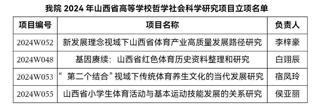 近日,山西省教育厅公布了2024年度山西省高等学校科技创新各类项目立项名单,公司共有4项研究项目成功获批。此次获批的研究项目聚焦于体育产业高质量发展、红色体育历史、体育养生文化、体育活动与运动技能关系领域,深度契合了当前体育领域多元化、高质量发展的时代需求。