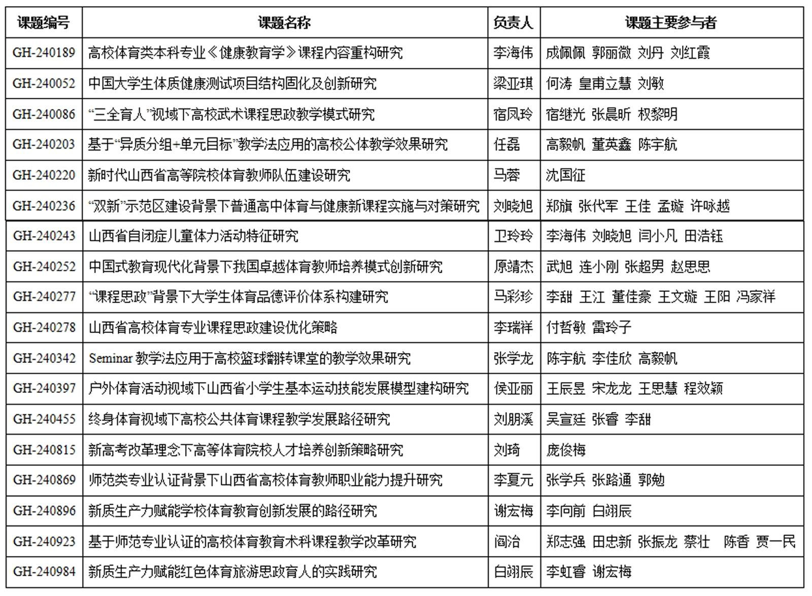 近日,山西省教育科学规划领导小组办公室公布山西省教育科学“十四五”规划2024年度课题立项的通知,公司表现突出,共获批18项课题。这些研究课题涵盖体育课程内容与教学方法创新、课程思政教学、体育教师队伍建设与职业能力提升、特殊群体体育活动、卓越体育团队与人才培养等体育教育的关键领域。在此次课题申报中,学院邀请专家对课题申报书进行了多轮论证,是学院开展有组织的科研的结晶。通过这些课题的深入研究,学院将致力于推动体育教育理论与实践的深度融合,不断提高体育教学质量,为实现教育现代化作出积极贡献。